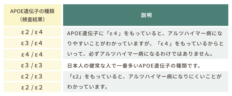 - APOE遺伝子には、「ε2」、「ε3」、「ε4」の3つの種類があります。わたしたちは2つのAPOE遺伝子をもっていて、それぞれ父親と母親から1つずつ受けつぎます。この遺伝子の種類によって、アルツハイマー病になりやすいかどうかが変わります。